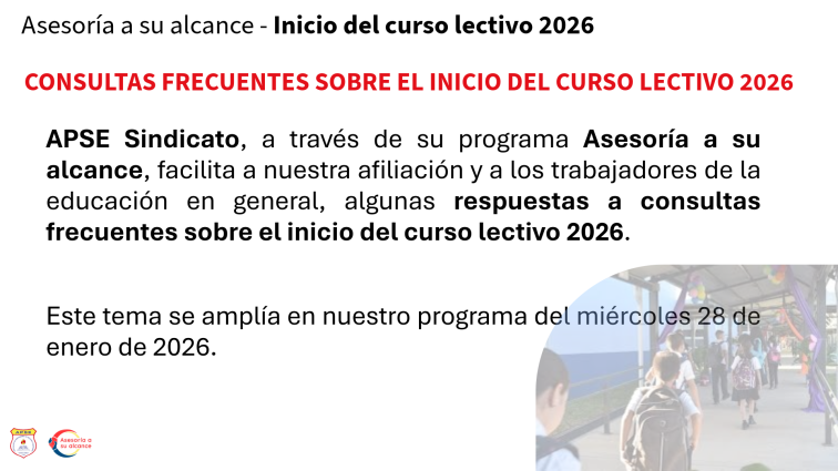 APSE Sindicato facilita a nuestra afiliación y a los trabajadores de la educación en general, algunas respuestas a consultas frecuentes sobre el inicio del curso lectivo 2026. Este tema se amplía en nuestro programa Asesoría a su alcance del miércoles 28 de enero de 2026. ¿Cómo es la organización del proceso formativo que va del … Sigue leyendo CONSULTAS FRECUENTES SOBRE EL INICIO DEL CURSO LECTIVO 2026