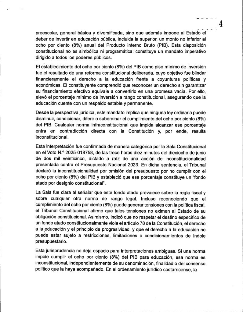 El Presidente de APSE le recordó a los diputados que APSE presentó una acción de inconstitucionalidad contra el presupuesto de la República del año 2023. En su voto a favor de APSE, la Sala Constitucional señala que el 8% del PIB es un “fondo atado constitucionalmente”, así garantizado por el artículo 78 de la Constitución Política. Además, la misma Sala señaló que ninguna ley ordinaria, como la Ley de Fortalecimiento de las Finanzas Públicas, está por encima de dicho mandato, ni puede limitar ni supeditar el 8% del PIB para educación pública.