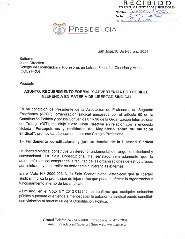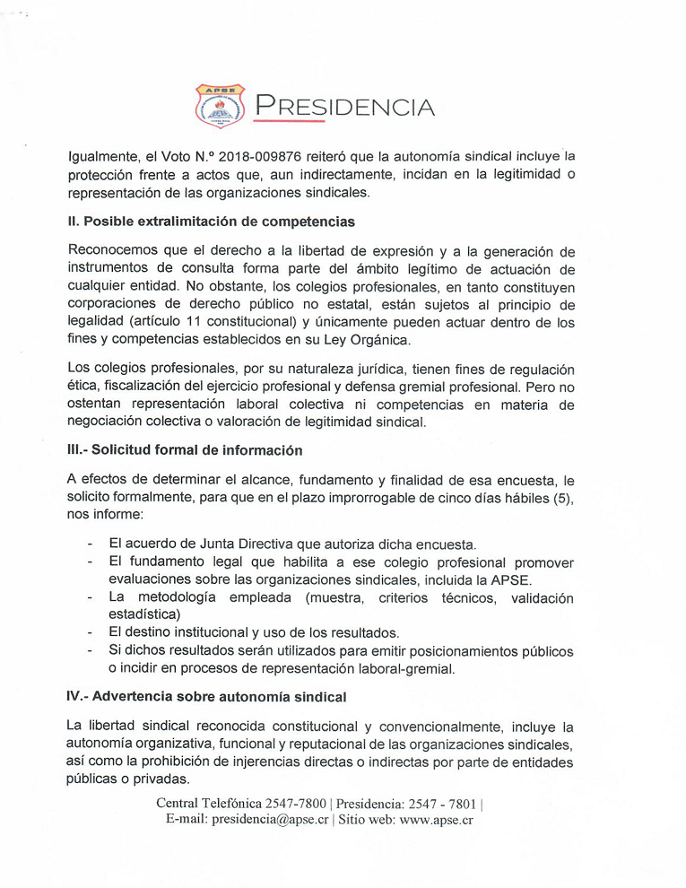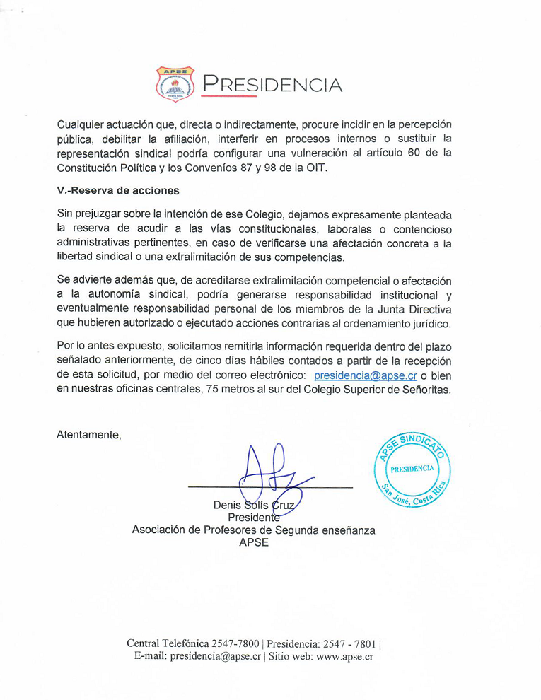 Por esta razón, la Junta Directiva de APSE, en su sesión 04-26 del 13 de febrero, aprobó una moción que autoriza a la Presidencia del sindicato a realizar las acciones legales, administrativas y/o judiciales que correspondan en defensa de nuestra organización y de la libertad sindical.