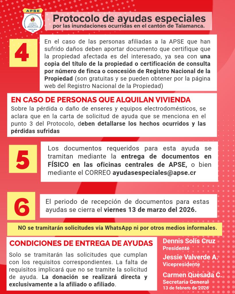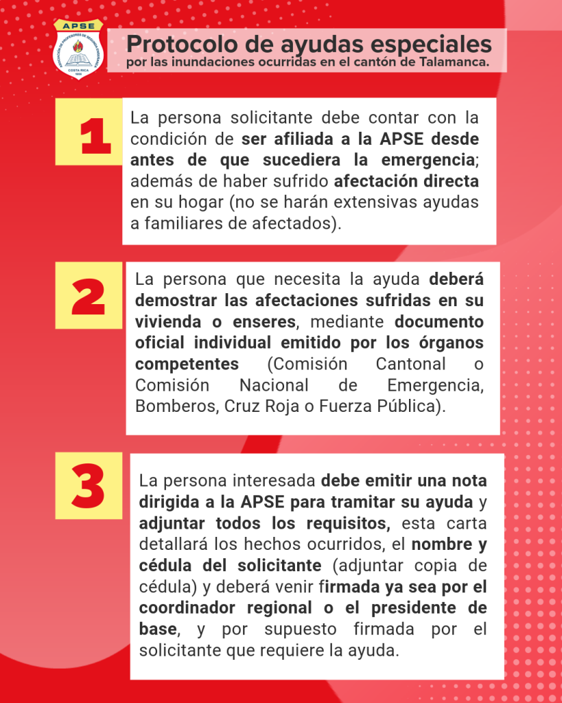 APSE establece el siguiente protocolo de recepción de solicitudes y entrega de ayudas especiales únicamente para afiliados afectados por las inundaciones ocurridas en el cantón de Talamanca.