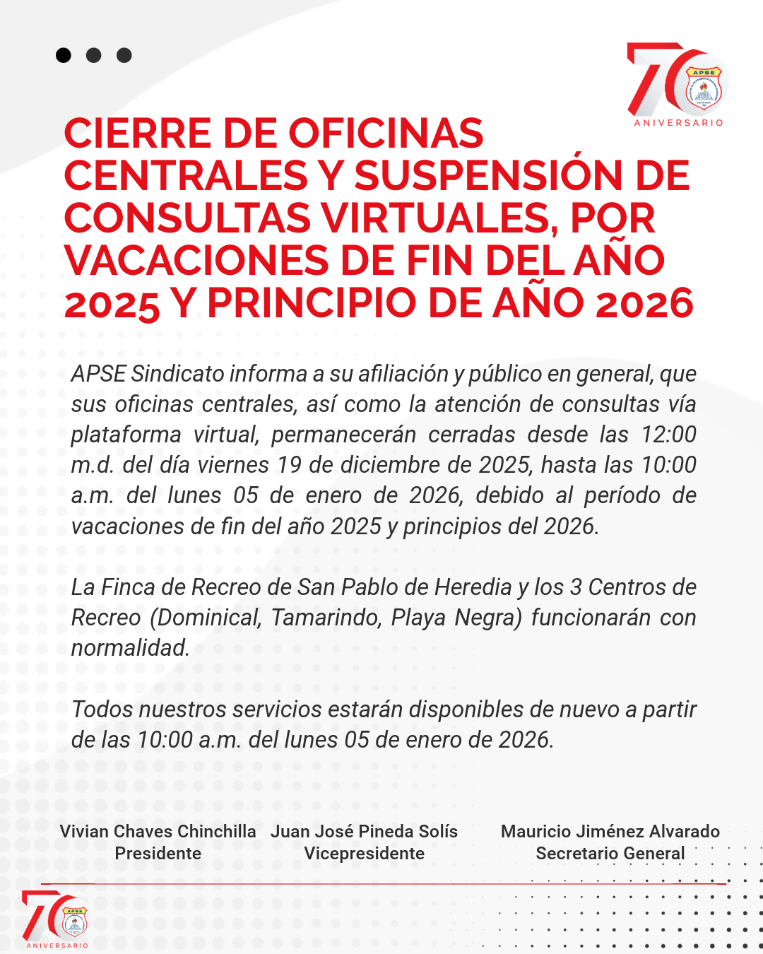 APSE Sindicato informa a su afiliación y público en general, que sus oficinas centrales, así como la atención de consultas vía plataforma virtual, permanecerán cerradas desde las 12:00 m.d. del día viernes 19 de diciembre de 2025, hasta las 10:00 a.m. del lunes 05 de enero de 2026, debido al período de vacaciones de fin del año 2025 y principios del 2026.