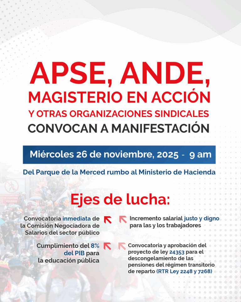 Convocatoria inmediata de la Comisión Negociadora de Salarios del Sector Público. Incremento salarial justo y digno para las y los trabajadores. Descongelamiento YA de las pensiones del régimen de reparto (RTR) bajo las leyes 2248 y 7268. Garantizar el 8% del PIB para educación en el presupuesto 2026.
